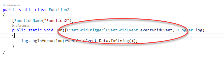 Creating a simple EventGrid trigger will produce some very simplistic code. The missing piece of this puzzle is establishing an EventGrid subscription for this particular Azure Function. This is done by using a WebHook.