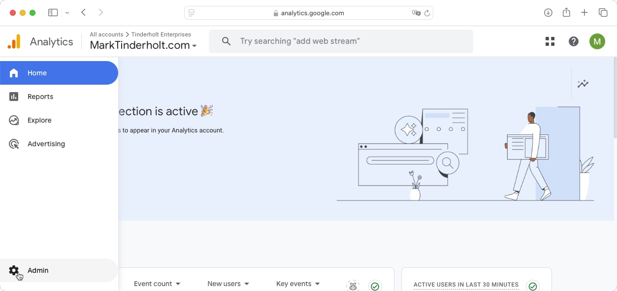 Once you’re in you need to create a new property. so start by opening the menu navigation and clicking at the bottom and selecting “Admin”.